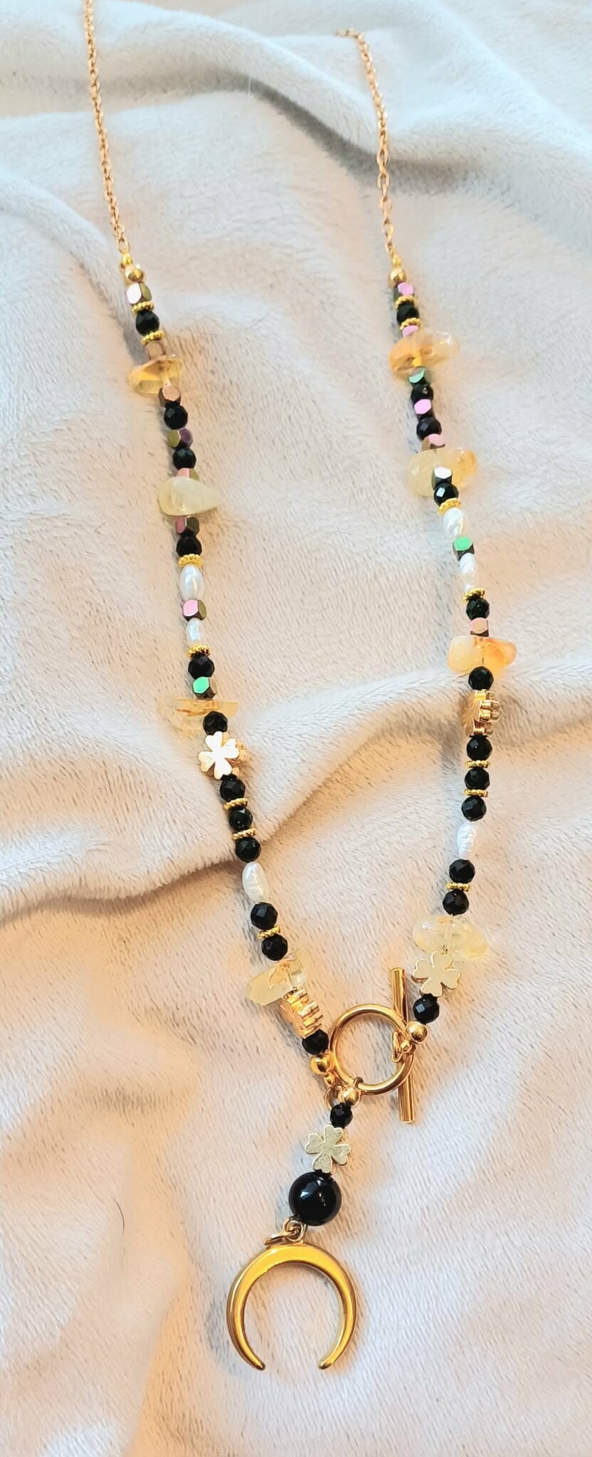 Moc i ochronę Turmalinu połączyłam z Cytrynem - dobrobytem i szczęściem - do tego trochę pięknego Hematytu aby mięć odwagę i perełki rzeczne - symbolizujące naszą kobiecość - a żeby ten naszyjnik pięknie się mienił dorzuciłam piasek pustyni !