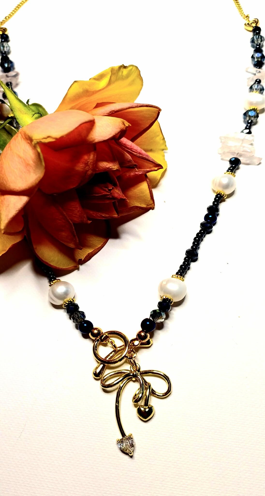 Romantyczna zawieszka w formie kokardki dodaje naszyjnikowi urokliwej subtelności, a niebieskie kryształki wprowadzają dodatkowy blask, tworząc harmonijną całość.