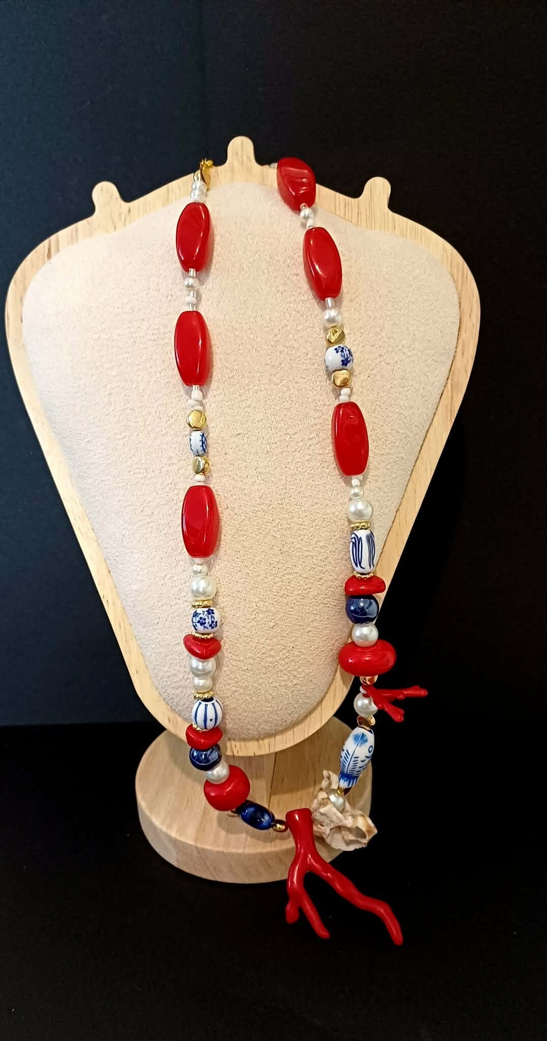 Jedyny w swoim rodzaju naszyjnik, który łączy w sobie intensywne kolory : złoty, czerwony, niebieski i biały, tworząc idealny dodatek na letnie dni.