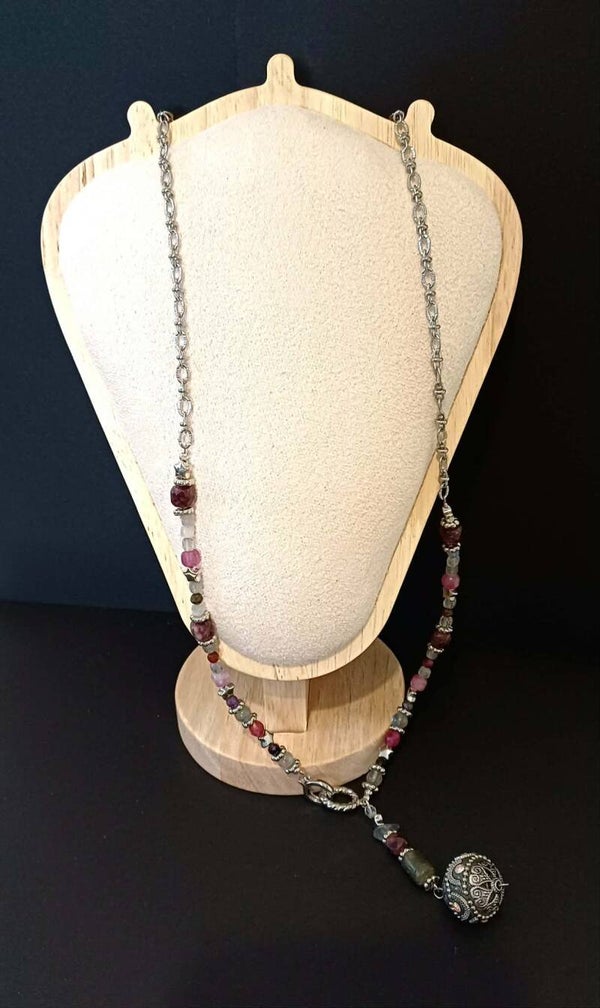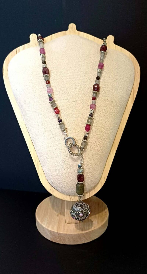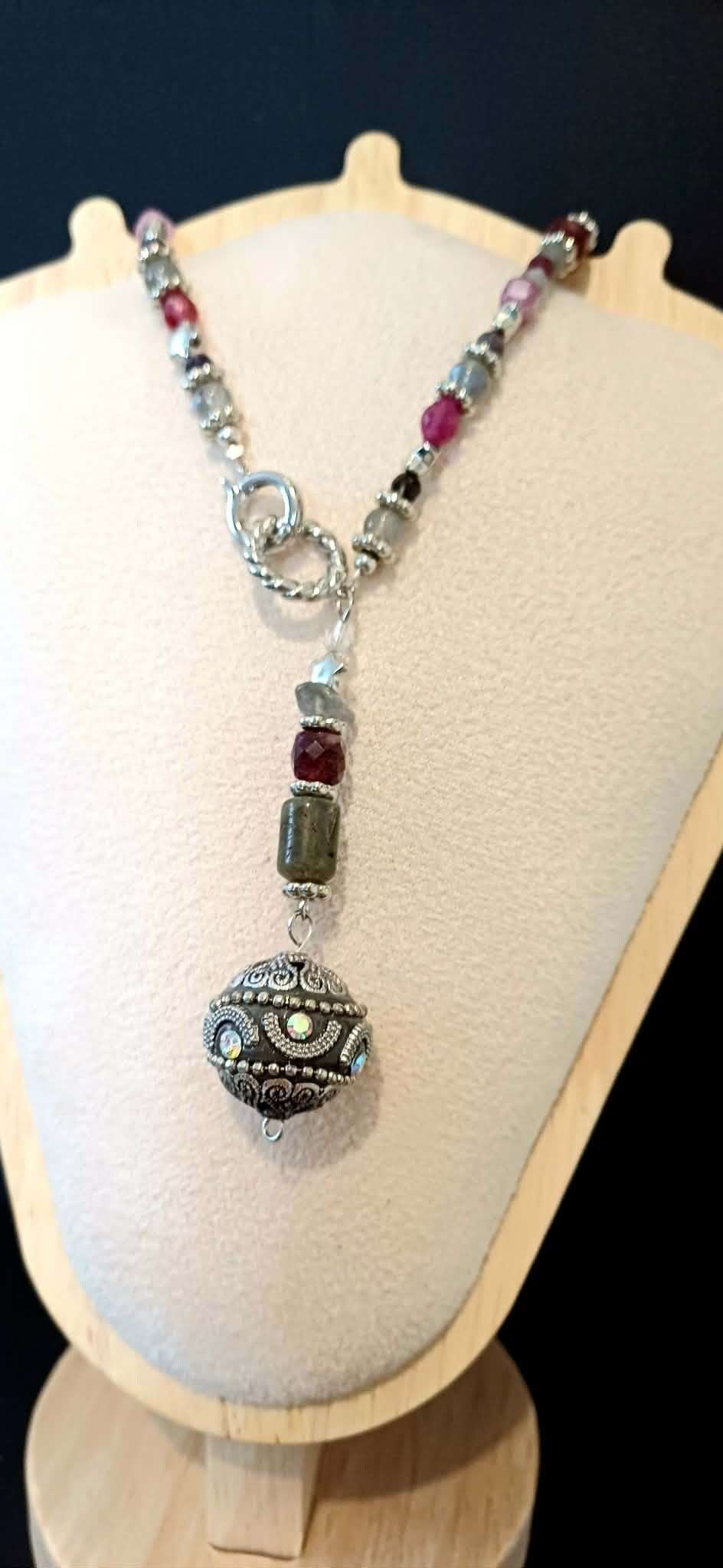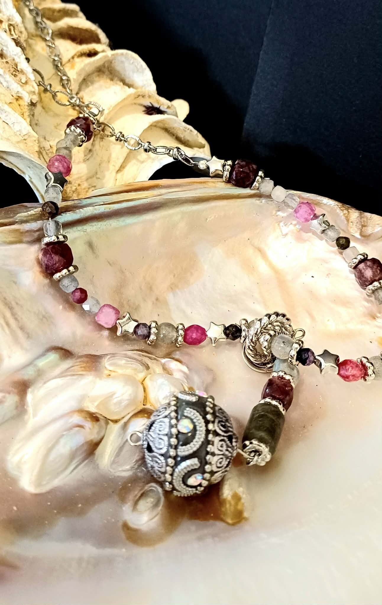 Wykorzystałam w nim piękną zawieszkę w formie kuli z kryształkami oraz wyjątkowymi kamieniami szlachetnymi, ten naszyjnik to prawdziwy talizman, który wspiera Twoją duchową podróż.