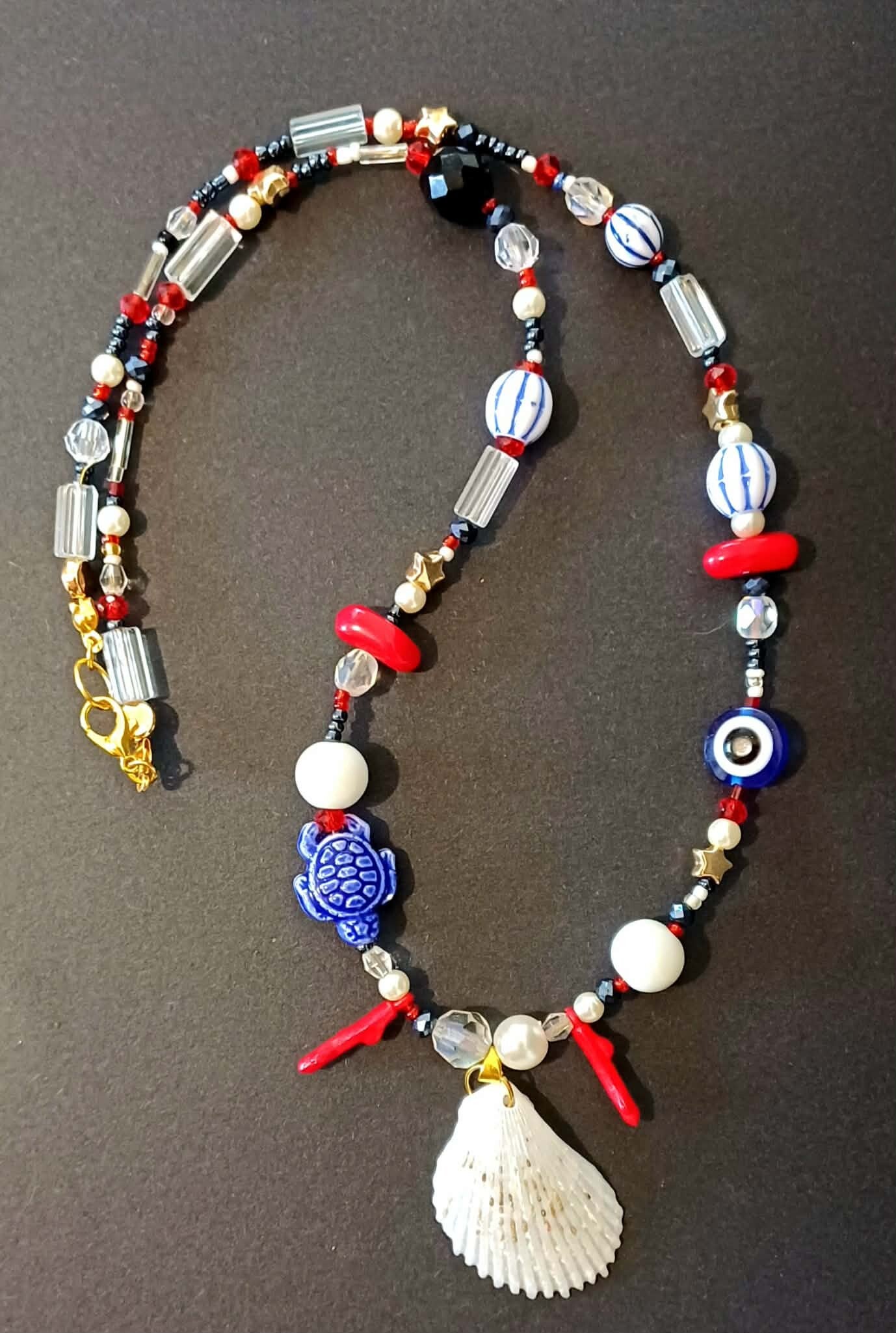 Wykonany z korali akrylowych, ceramicznych ,perełek i prawsziwej muszli, ten naszyjnik to doskonały wybór dla miłośniczek morskich klimatów i przygód !