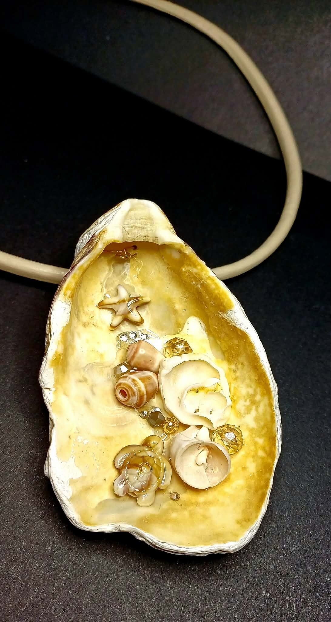 Ten autorski projekt jest unikatowy bo ta muszla jest wyjątkowa. Ta jest bardzo duża a ja dodałam jeszcze kilka prawdziwych muszelek, rozgwiazdę i żółwika z akrylu - symbol długowieczności! Kilka kryształków -beżowych i Swarowskiego - dodało pięknego blasku temu projektowi.