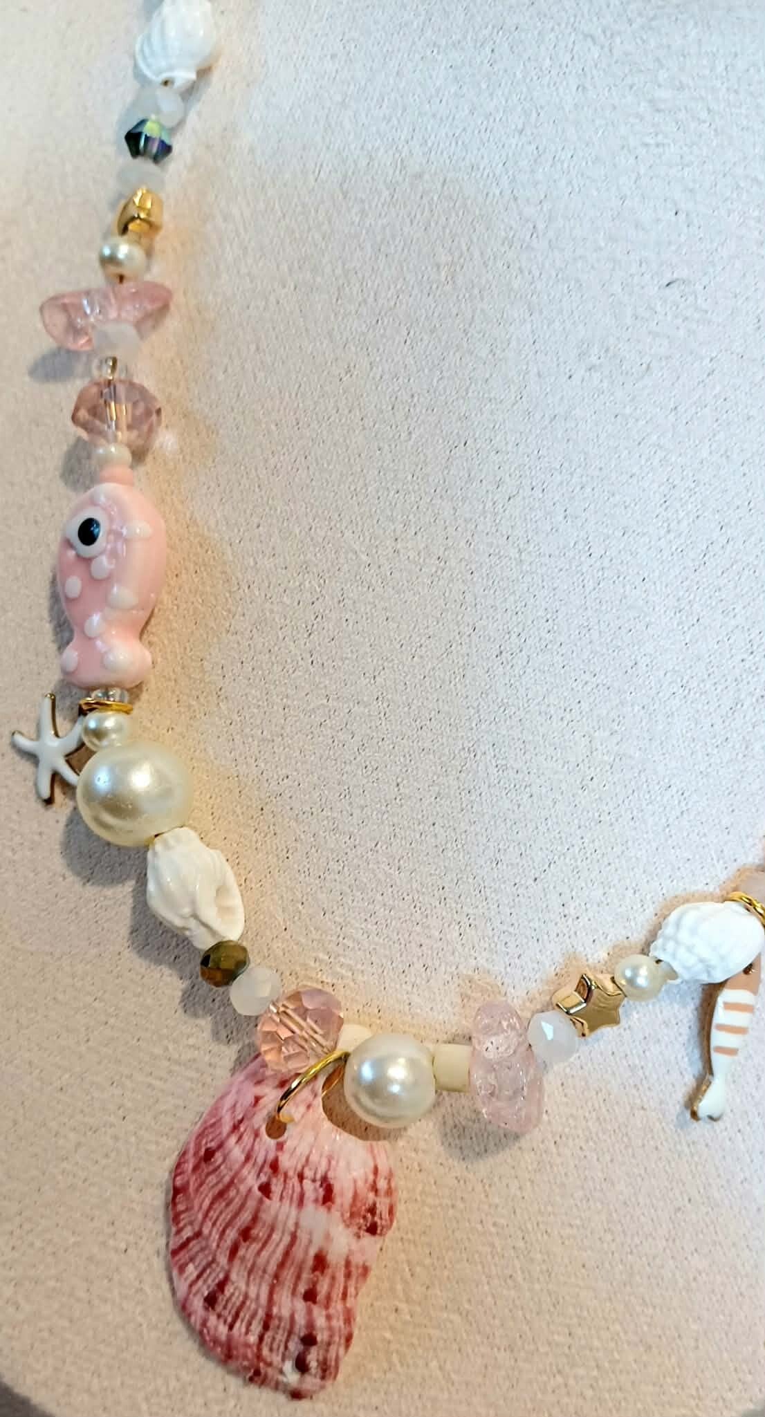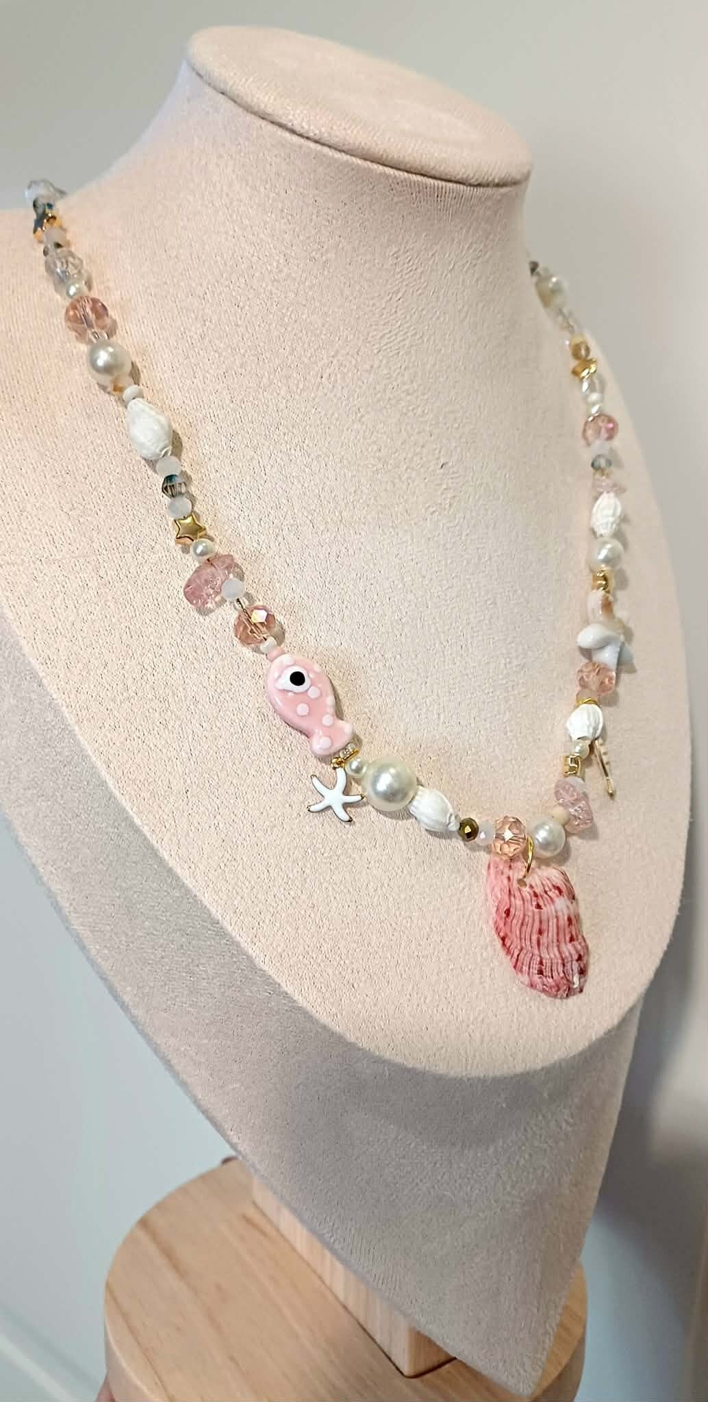 Naszyjnik połączenie kryształków, delikatnych perełek i muszelek, które szepczą o radości, beztrosce i letnich dniach spędzonych na plaży. Każdy element został starannie dobrany, aby stworzyć kompozycję pełną wdzięku i dziewczęcego uroku.