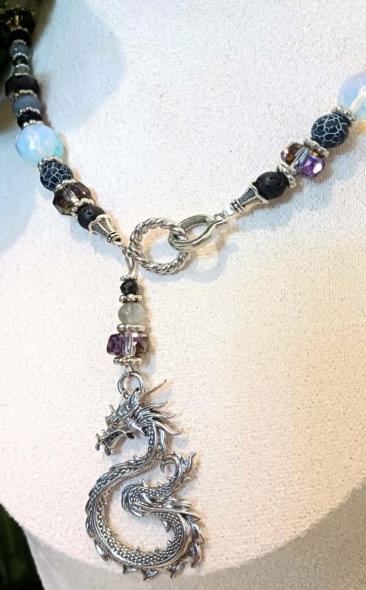 Centralnym elementem naszyjnika jest smoczy wisiorek- jego siłę i elegancję podkreślają szlachetne kamienie: